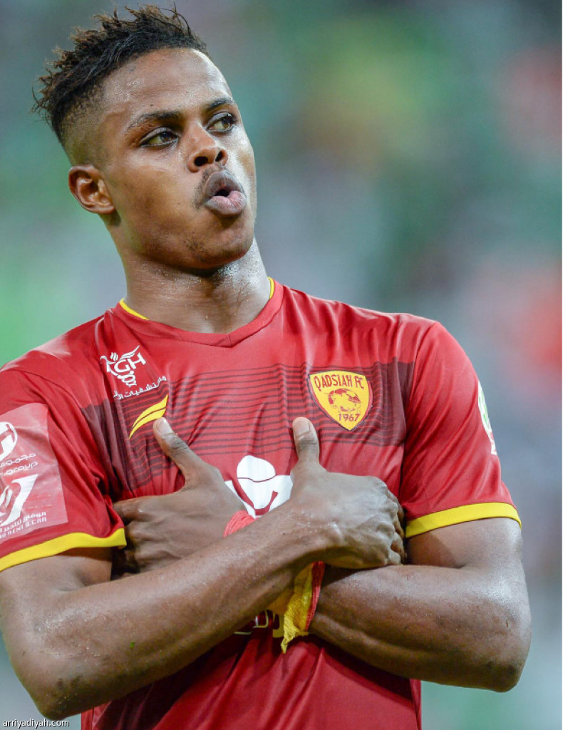 أوقف هارون كمارا مهاجم فريق القادسية الأول لكرة القدم، انطلاقة مضيفه الأهلي عندما أحرز هدفين في الشوط الثاني، أعادا فريقه إلى نغمة الانتصارات في الجولة التاسعة من دوري كأس محمد بن سلمان للمحترفين.. وفي الصورة التي التقطت أمس، كمارا يحتفل على طريقته الخاصة عقب تسجيله الهدف الثاني في مرمى الأهلي تصوير: علي خمج
