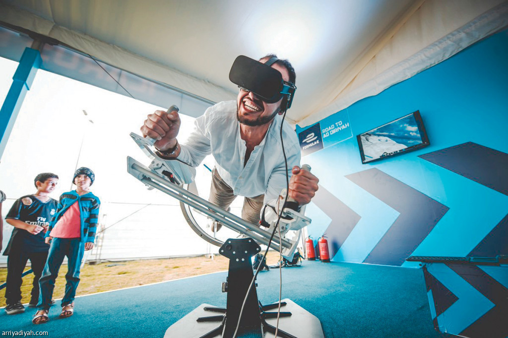 صورة التقطت أمس لأحد زوار قرية “فورمولا إي”، في الكورنيش الجديد في الخبر، أثناء مشاركته في تحليقه في الفضاء من خلال تكنولوجيا الواقع الافتراضي.(المركز الإعلامي ـ هيئة الرياضة)