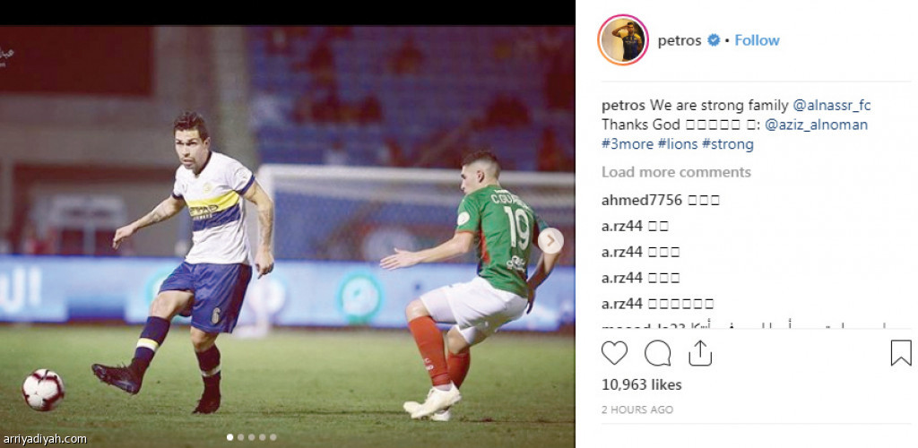 ونشر بيتروس على حسابه في "إنستجرام" صورة له بقميص النصر وكتب: "نحن عائلة قوية"، في رد على ما أثير أخيراً على أن هناك مشكلات بين اللاعبين.