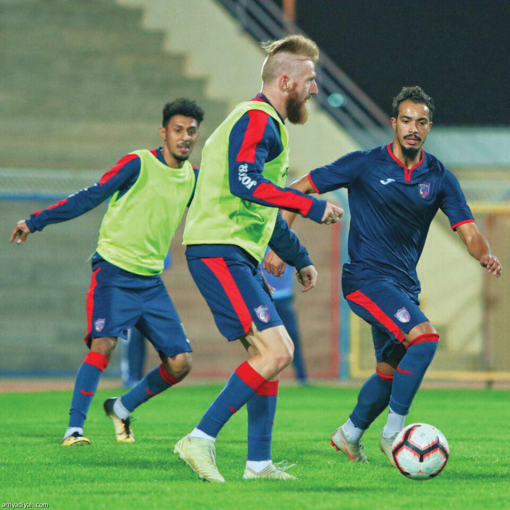 صورة التقطت أمس من المناورة التي فرضها الروماني إيسالا مدرب فريق الحزم الأول لكرة القدم في مقر النادي.. ويظهر في التدريبات البرازيلي فاجنر ينطلق بالكرة وسط ترقب عبدالرحمن الريو وإسماعيل مسملي (المركز الإعلامي ـ الحزم)
