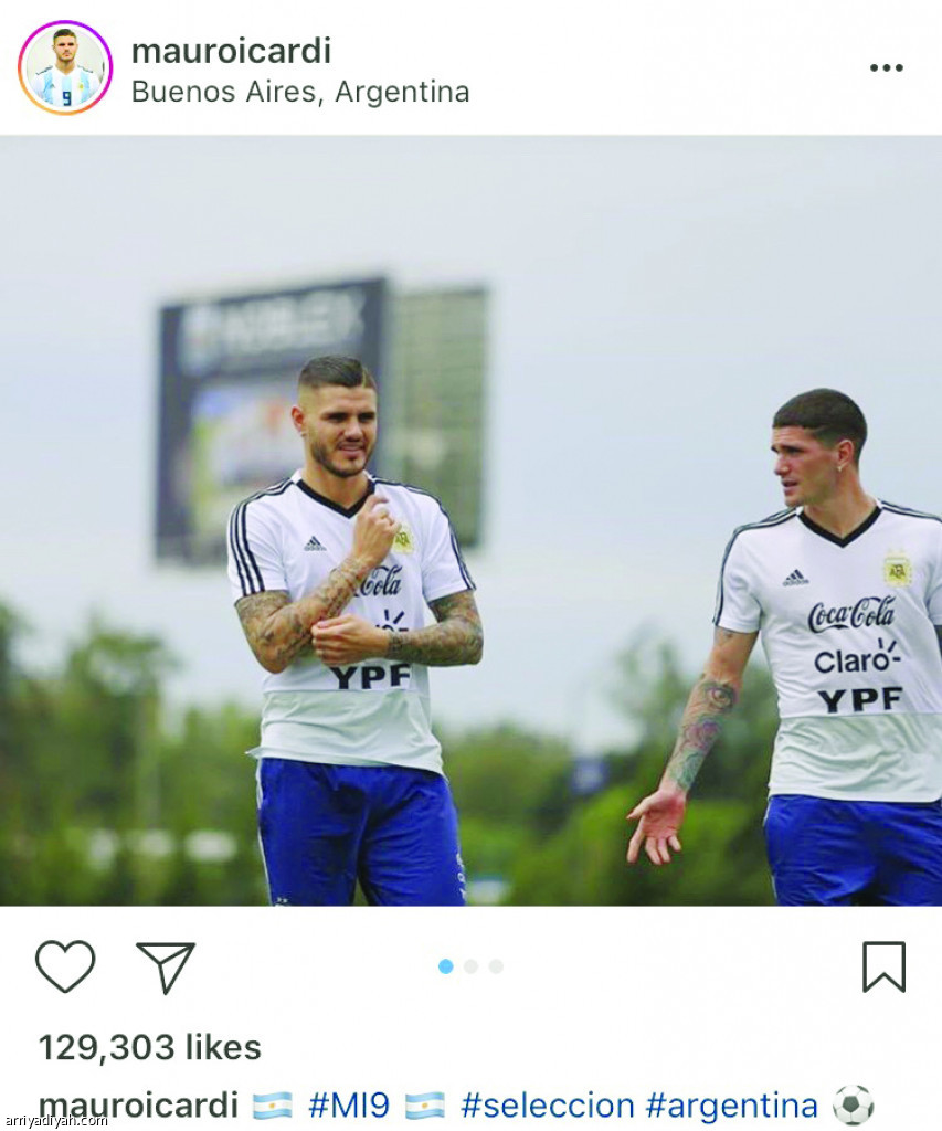 بث الأرجنتيني ماورو إيكاردي مهاجم منتخب الأرجنتين الأول لكرة القدم عبر حسابه الشخصي في موقع التواصل الاجتماعي "إنستجرام" صوراً من مشاركته في تدريبات منتخب بلاده مساء أمس استعداداً لخوض المواجهات الودية خلال فترة التوقف الجارية في الدوريات العالمية بسبب فيفا دي، ووصل عدد الإعجابات إلى نحو 129 ألفاً وأكثر من 150 تعليقاً من متابعي النجم العالمي.
