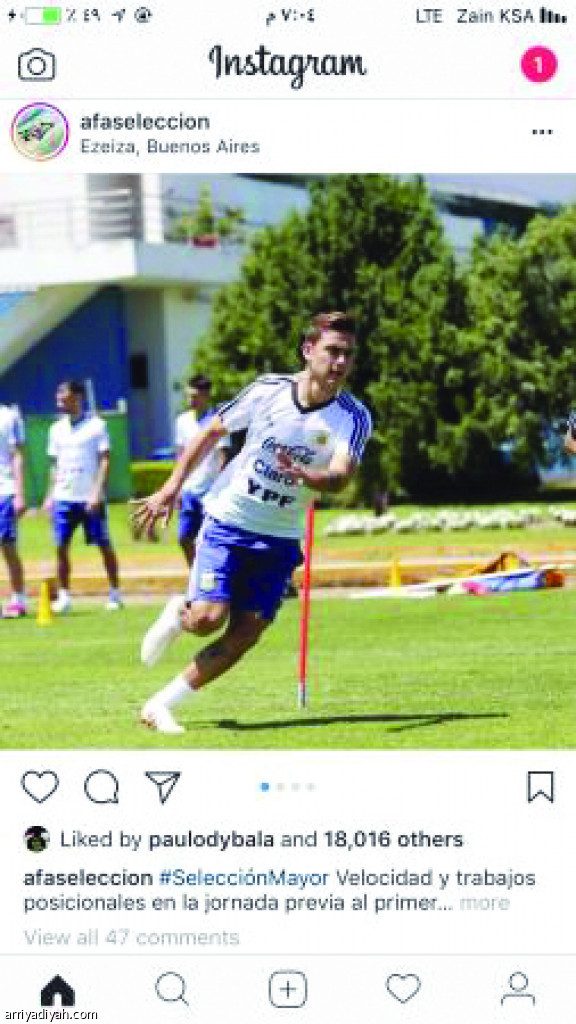 بث حساب المنتخب الأرجنتيني الأول لكرة القدم في موقع التواصل الاجتماعي إنستجرام صورة من مشاركة ديبالا، نجم يوفنتوس ومنتخب بلاده، في الحصة التدريبية أمس استعدادًا لخوض المباريات الدولية الودية خلال فترة التوقف الجارية "أيام فيفا". ونالت الصورة 18 ألف إعجاب خلال ساعة واحدة من بثها.