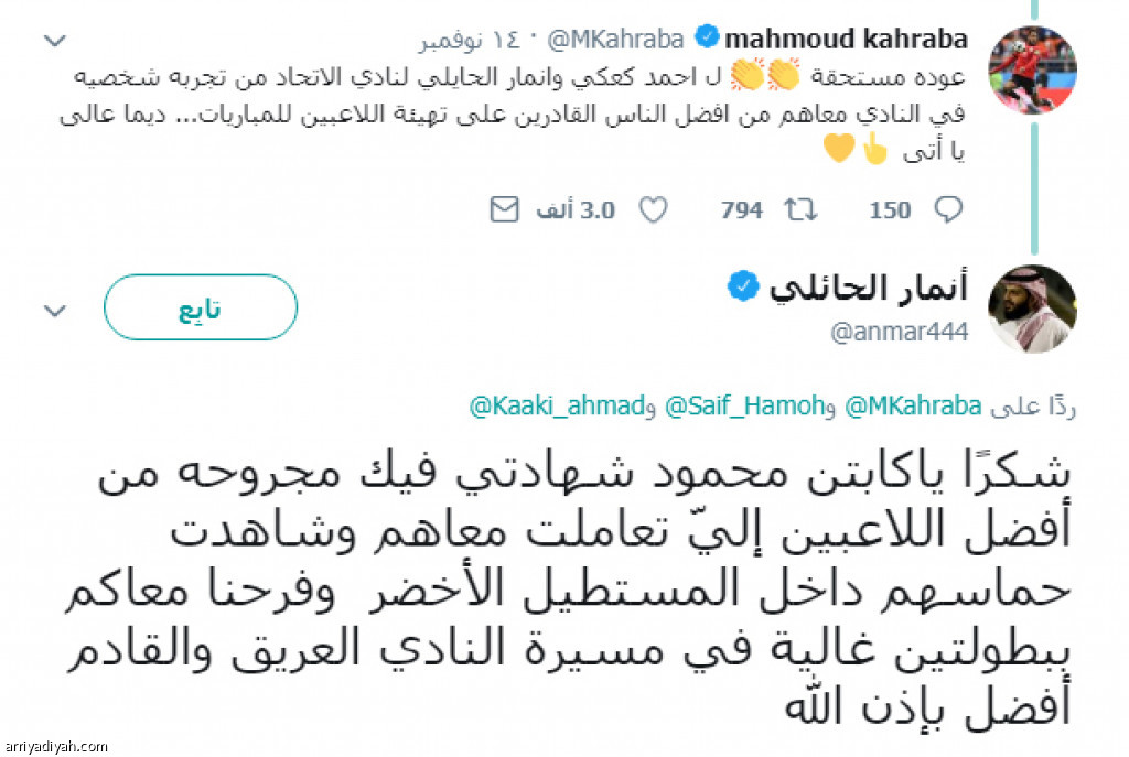 وردّ أنمار الحائلي، الرئيس السابق للاتحاد، على تغريدة كهربا كاتبًا: "شكرًا ياكابتن محمود شهادتي فيك مجروحة من أفضل اللاعبين الذين تعاملت معهم".