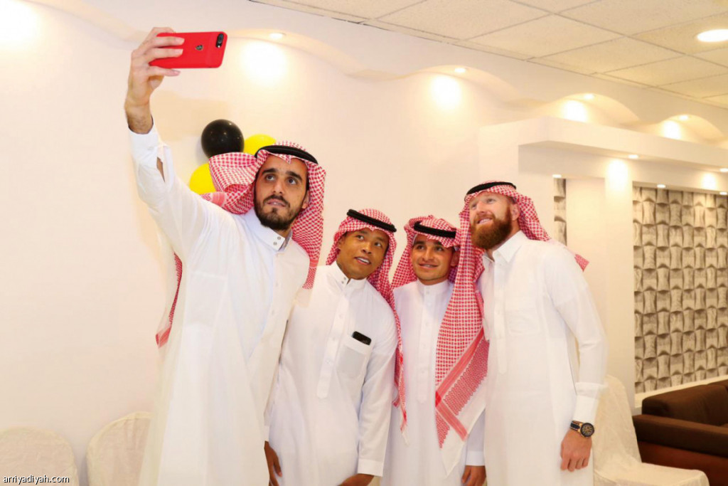 حظي فريق التعاون الأول لكرة القدم ومسؤولوه باستضافة من جانب إدارة نادي الحزم، على هامش مباراة الفريقين الودية أمس في الرس، التي فاز فيها فريق الحزم الأول لكرة القدم بهدفين مقابل هدف واحد.. وفي الصورة التي التقطت أمس يظهر الجزائري مالك عسلة حارس مرمى الحزم، يأخذ “سيلفي” مع البرازيلي أليماو، والكولومبي جون باجوي، والإكوادوري كارلوس فيراود، زملائه في الفريق، أثناء حضورهم الاحتفالية مرتدين الزي السعودي (المركز الإعلامي . الحزم)