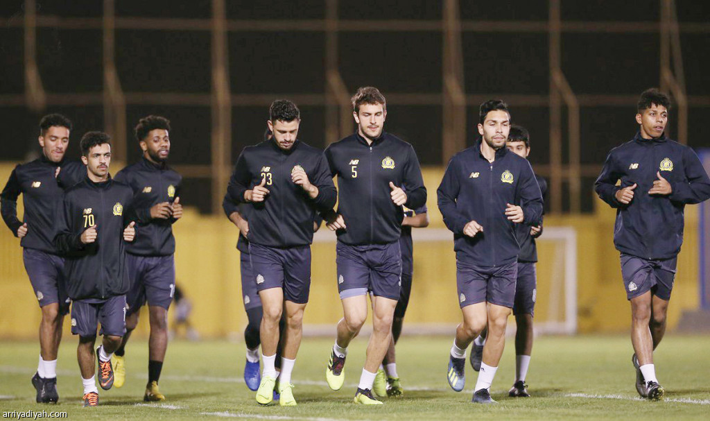 صورة التقطت أمس للاعبي فريق النصر يؤدون تدريبات الإحماء (المركز الإعلامي ـ النصر)