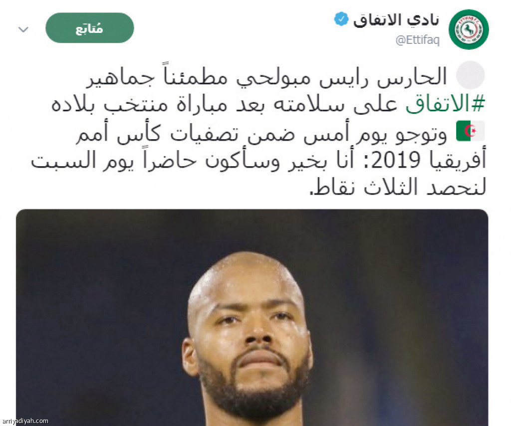طمأن نادي الاتفاق في تغريدة نشرها حسابه على “تويتر” جماهير النادي على رايس مبولحي حارس المنتخب الجزائري.