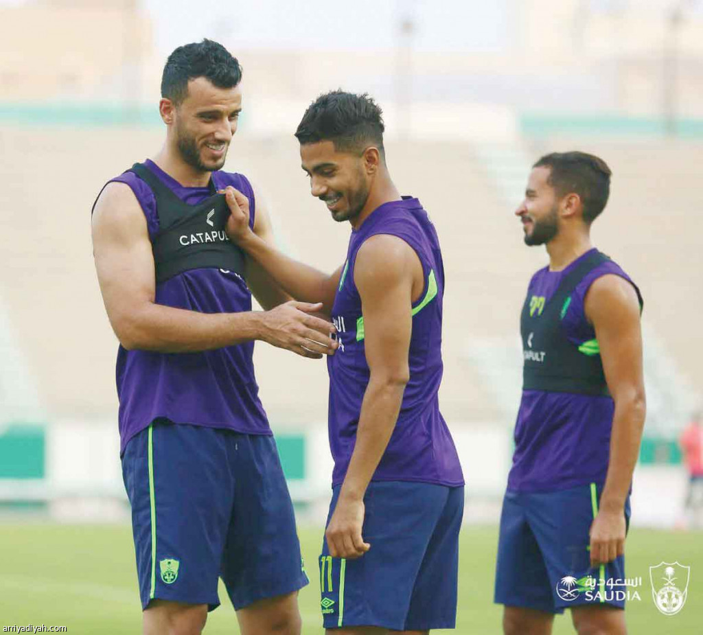 صورة التقطت لعمر السومة مهاجم الأهلي في حديث مع زميله حسين المقهوي في حصة تدريبية سابقة (أرشيفية)