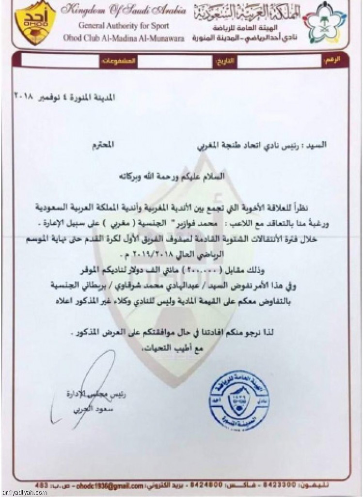 وأرسلت الإدارة الأحدية خطابًا رسميًّا إلى نظيرتها في النادي المغربي، حصلت “الرياضية” على نسخة منه، تعرض فيه ضمَّ فوزير، المعار من النصر السعودي حتى نهاية العام، مقابل 200 ألف دولار.