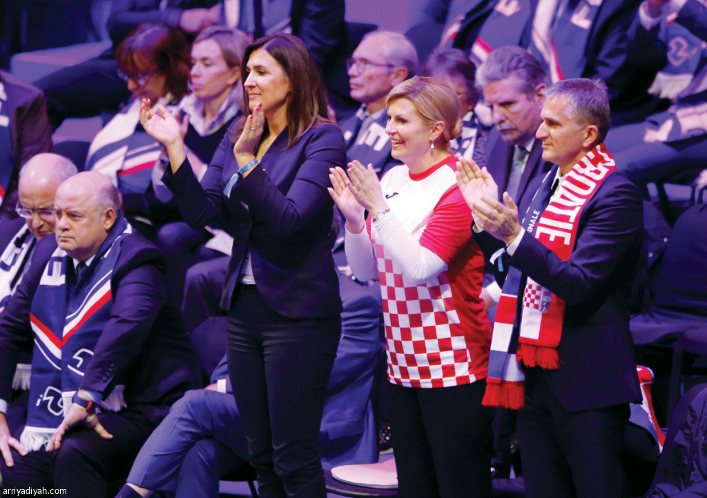 صورة التقطت أمس لكوليندا جرابار كيتاروفيتش رئيسة كرواتيا أثناء تفاعلها مع منتخب بلادها للتنس خلال المباراة النهائية في كأس ديفيز أمام المنتخب الفرنسي على ملعب بيار موروا في فرنسا وتوج الكروات بها (رويترز)