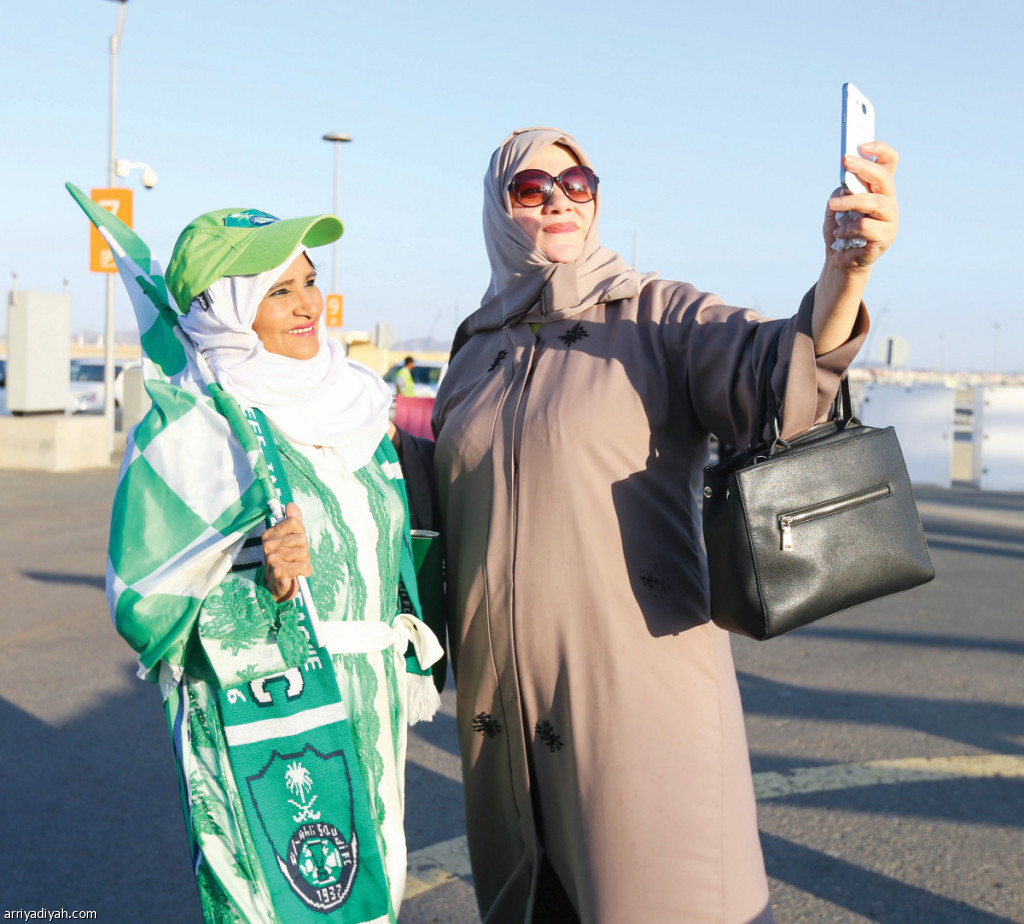صورة التقطت أمس لسيدة تأخذ "سيلفي" مع المشجعة الأهلاوية تصوير: عبد الوهاب خبتي