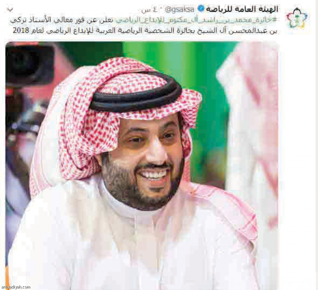 ونقلت الهيئة العامة للرياضة، عبر حسابها الرسمي في "تويتر"، فوز تركي آل الشيخ، رئيس الهيئة العامة للرياضة، رئيس اللجنة الأولمبية العربية السعودية، رئيس الاتحاد الرياضي للتضامن الإسلامي، ورئيس الاتحاد العربي لكرة القدم، بجائزة الشخصية الرياضية العربية للإبداع الرياضي لعام 2018، التي ينظمها مجلس أمناء "جائزة محمد بن راشد آل مكتوم للإبداع الرياضي"، إحدى "مبادرات محمد بن راشد آل مكتوم العالمية".
