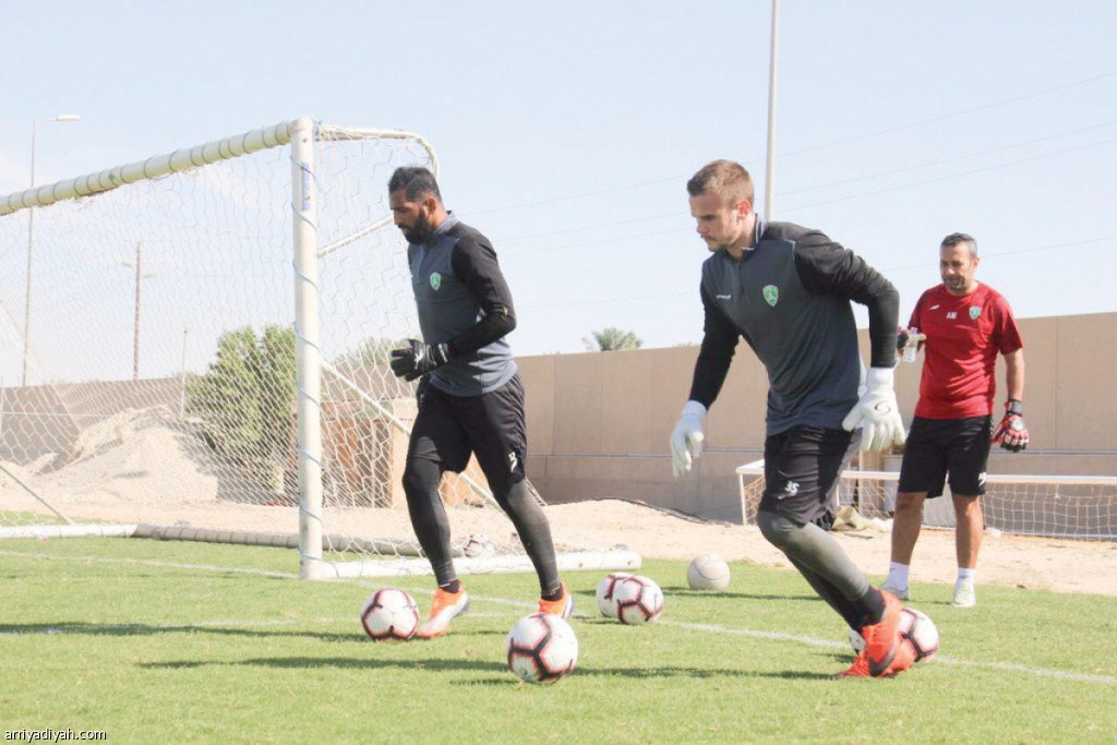 صورة التقطت أمس للأوكراني ماكسيم وعلي المزيدي، حارسَي فريق الفتح، أثناء التدريب بالكرة (المركز الإعلامي ـ الفتح)