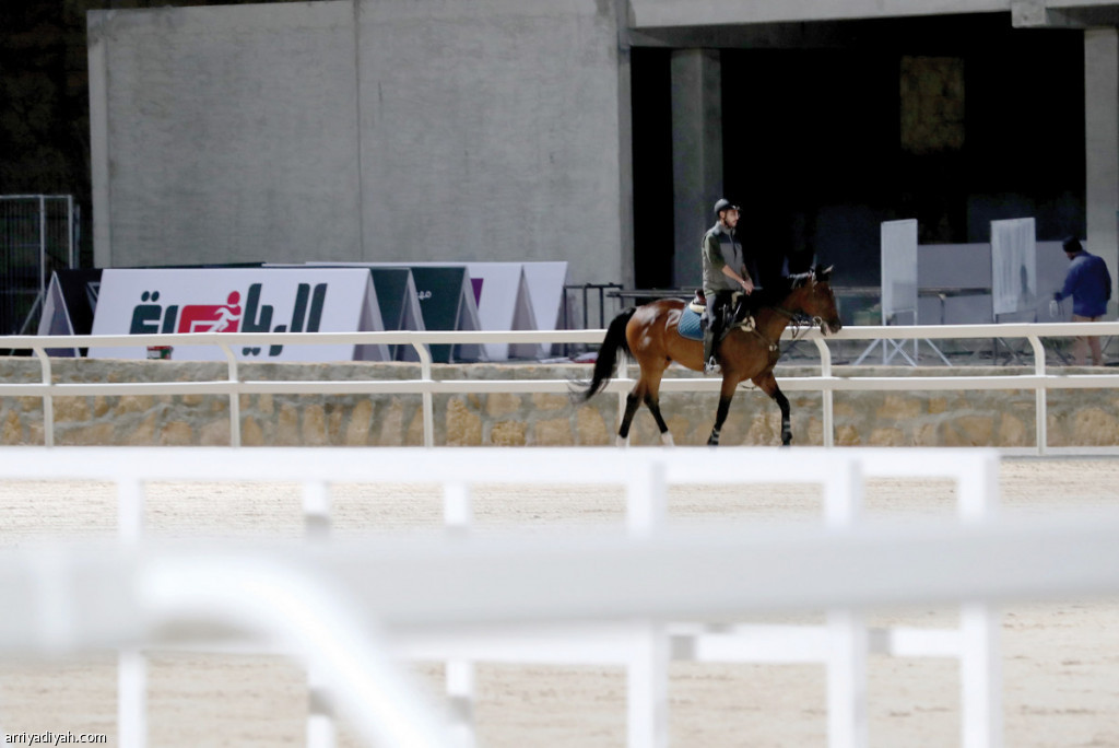 صورة التقطت أمس لأحد الفرسان المشاركين يجري تجربة قبل خوض منافسات مهرجان الدرعية الدولي لقفز الحواجز التي تنظم في مركز الدهامي للفروسية تصوير: فهد المري