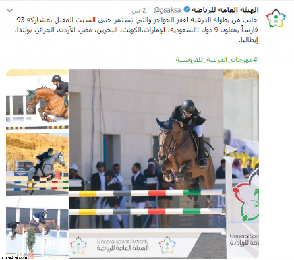 تفاعل نحو 3 ملايين و500 ألف مستخدم لموقع التواصل الاجتماعي "تويتر" مع هاشتاق #مهرجانالدرعيةللفروسية، الذي دشن بمناسبة انطلاق مهرجان الدرعية الدولي لقفز الحواجز في مركز الدهامي للفروسية في الدرعية، ويستمر لمدة ثلاثة أيام ضمن جولات الدوري العربي للفروسية المؤهلة إلى بطولة كأس العالم 2019 لقفز الحواجز.وبلغ عدد زوار الهاشتاق 3.547.221 زائرًا، فيما بلغ عدد المشاركين فيه 3.118.440 مشاركًا.