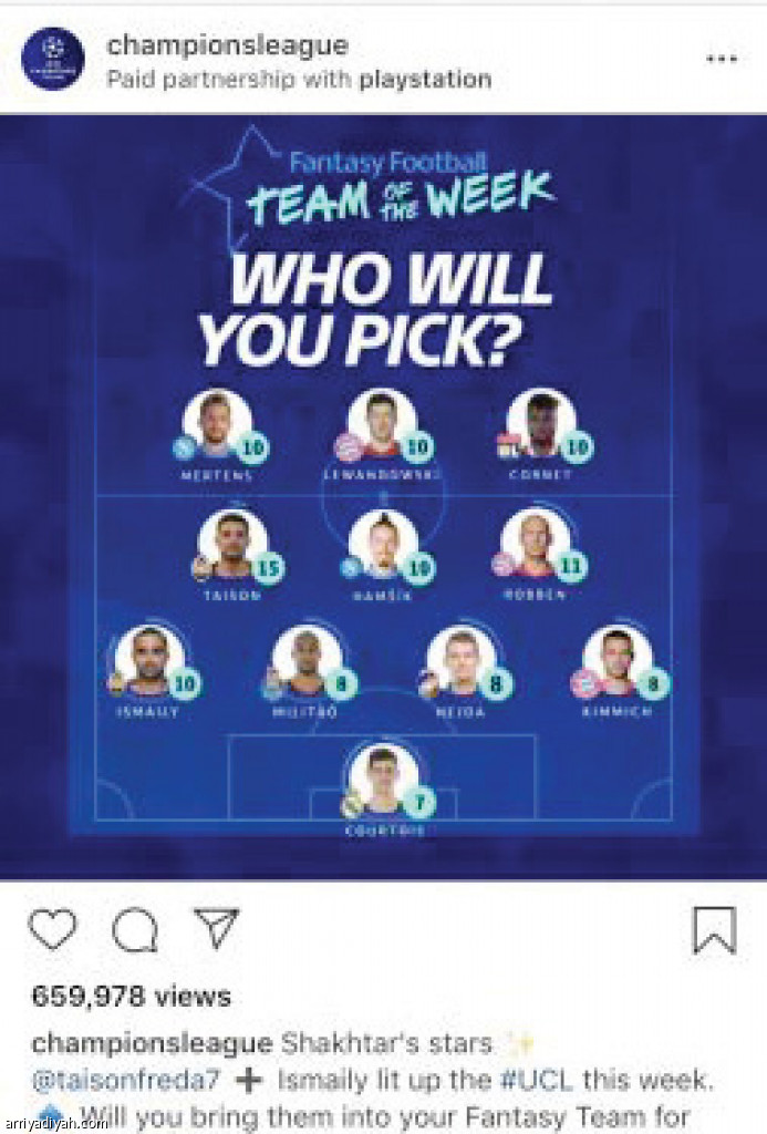بث الحساب الرسمي لدوري أبطال أوروبا عبر موقع التواصل الاجتماعي “إنستجرام” فيديو يوضح فيه نجوم الجولة الماضية من المسابقة الأوروبية. وشهد الفيديو انتشاراً واسعاً في منصات التواصل الاجتماعي، ونال نحو 659 ألف مشاهدة خلال أكثر من 12 ساعة، وأكثر من 100 تعليق من متابعي الحساب.