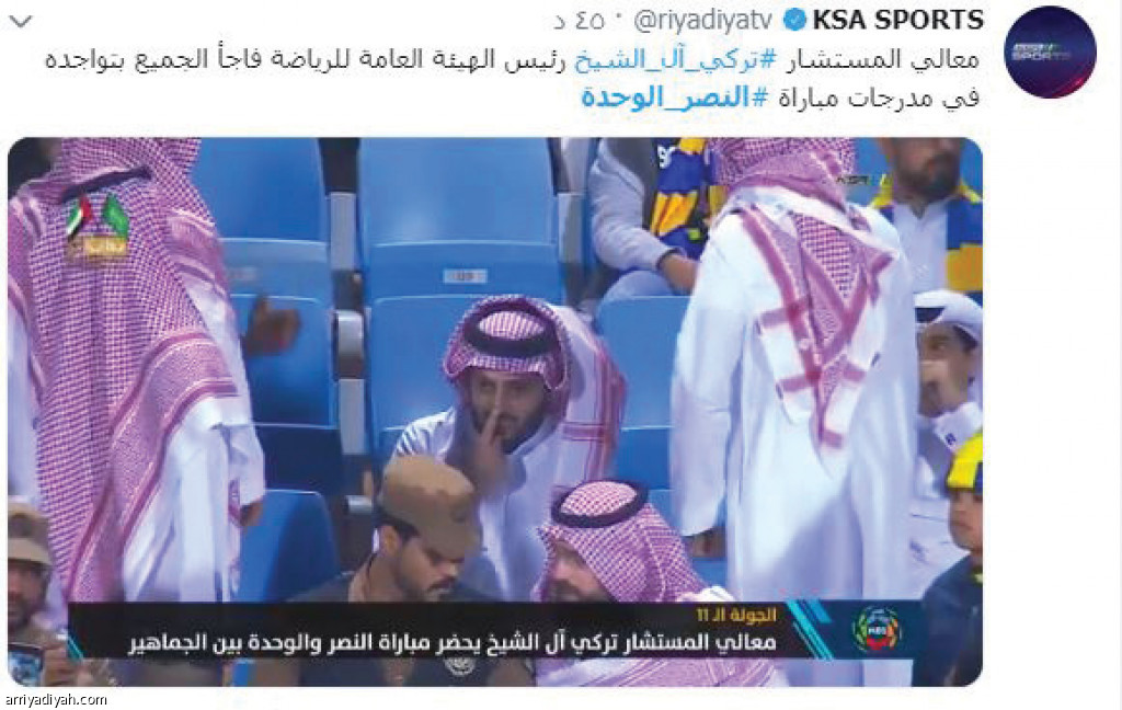 نال فيديو حضور تركي آل الشيخ ،رئيس هيئة الرياضة مباراة النصر والوحدة، ضمن منافسات دوري كأس محمد بن سلمان للمحترفين، على الأكثر مشاهدة في الهاشتاق بنحو 50 ألف مشاهدة خلال أقل من ساعة في هاشتاق المباراة، وشهد الفيديو انتشارًا واسعًا في الطائر الأزرق، وبقية منصات التواصل الاجتماعي.