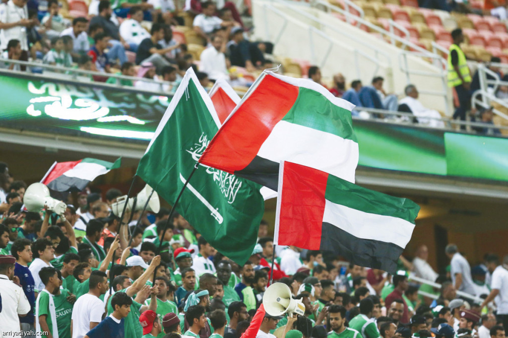 احتفلت إدارة النادي الأهلي باليوم الوطني الإماراتي الـ 47 وذلك قبل بداية مباراة الفريق الأول لكرة القدم أمام وفاق سطيف الجزائري.. وفي الصورة التي التقطت أمس جماهير تحمل العلمين السعودي والإماراتي في مدرجات ملعب مدينة الملك عبد الله الرياضية "الجوهرة المشعة" في جدةتصوير: عدنان مهدلي
