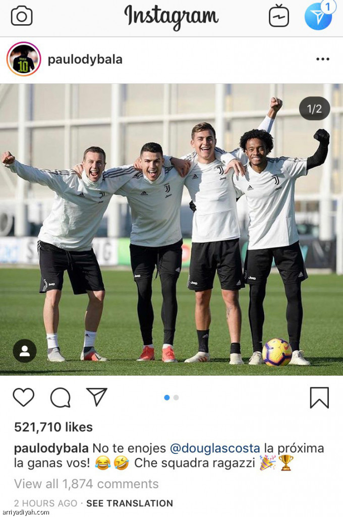 بث الأرجنتيني باولو ديبالا، مهاجم فريق يوفنتوس الإيطالي الأول لكرة القدم، عبر حسابه الرسمي في موقع التواصل الاجتماعي "إنستجرام"، صورة برفقة الثلاثي البرتغالي رونالدو والكولومبي كوادرادو والأوروجوياني بيندكور وهم يحتفلون بتحقيق الانتصار خلال المناورة التدريبية أمس. ونالت الصورة إعجاب نحو 747 ألفًا خلال 4 ساعات من بثها، وأكثر من 2500 تعليق.