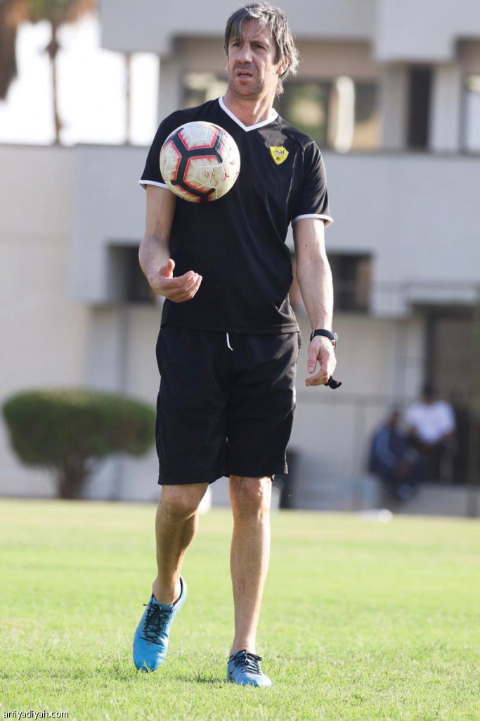 صورة التقطت أمس للبرتغالي باولو ألفيس مدرب فريق أحد ممسكًا بالكرة (المركز الإعلامي ـ أحد)