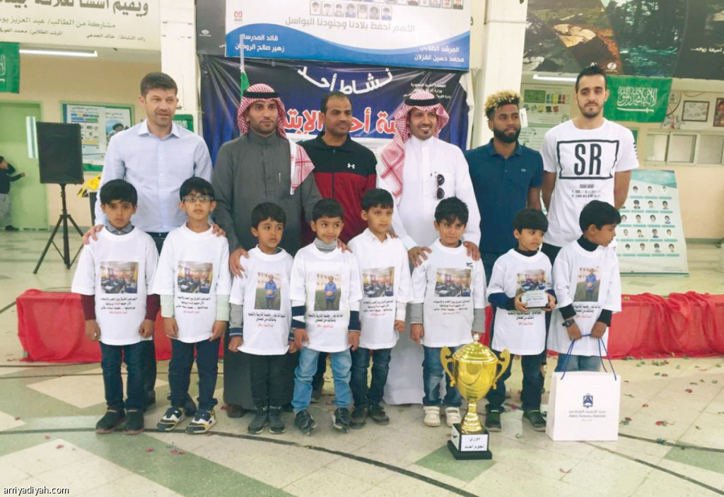 شارك وفد من نادي الحزم أمس في اليوم الرياضي الختامي في مدرسة أحد الابتدائية في الرس.. وفي الصورة التي التقطت أمس يظهر عبد الله المقحم رئيس النادي وعلى يساره البرازيلي مورالها والجزائري مليك عسلة لاعبا الفريق الأول.. وعلى يمينه أحد معلمي التربية البدنية في المدرسة وزهير الروضان مدير الكرة في النادي ومدير المدرسة والروماني دانييل إيسايلا مدرب فريق الحزم الأول لكرة القدم.. وأمامهم مجموعة من أطفال المدرسة (المركز الإعلامي ـ الحزم)