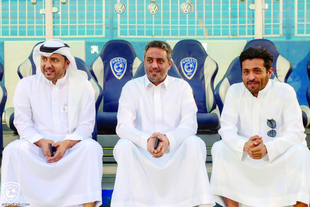 صورة التقطت أمس لمحمد بن فيصل رئيس الهلال و فهد الراشد نائبه وطارق التويجري عضو مجلس الإدارة يتابعون التدريب