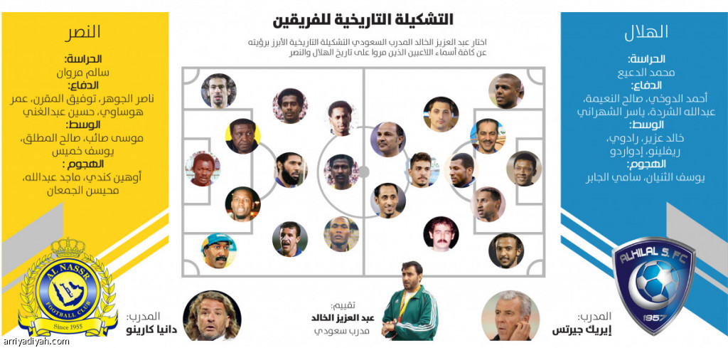 اختار عبد العزيز الخالد المدرب السعودي التشكيلة التاريخية الأبرز برؤيته عن كافة أسماء اللاعبين الذين مروا على تاريخ الهلال والنصر