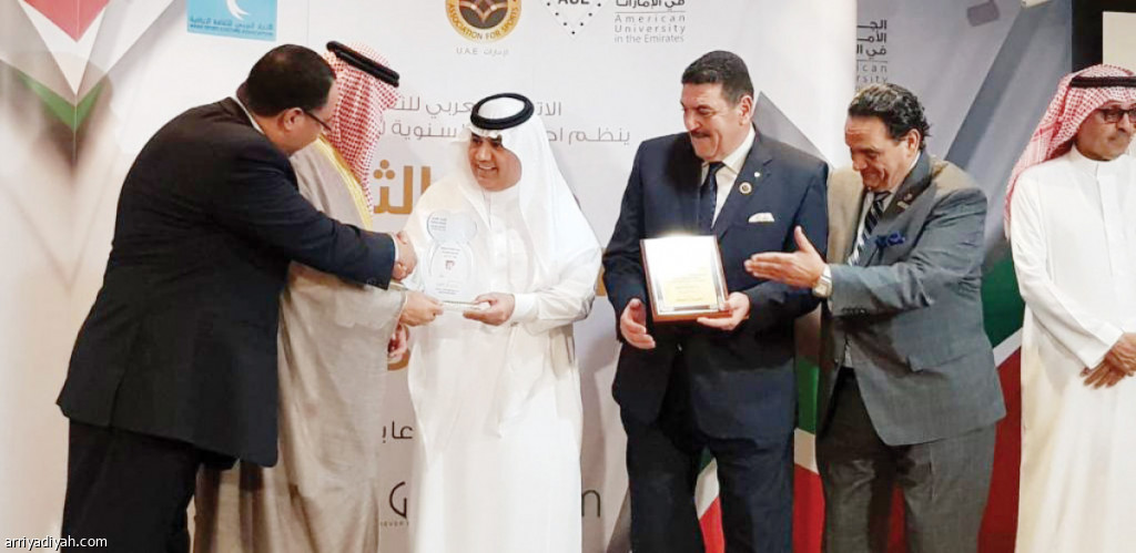 صورة التقطت لطلال بن بدر رئيس المجلس الرياضي العربي يسلم السلمي جائزة أوسكار الشخصية القيادية الرياضية التي منحت لتركي آل الشيخ (المركز الإعلامي -اللجنة الأولمبية)