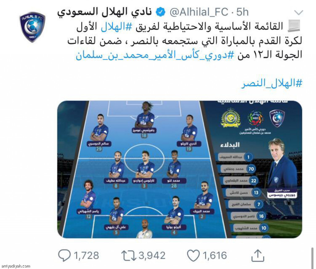 وفي المقابل، تفوق حساب نادي الهلال الرسمي في عدد التغريدات في المضمون ذاته، حيث أطلق 26 تغريدة وسط تفاعل كبير في تغريدة قائمة الفريق التي أعيدت 3.942 مرة، ورد عليهـا 1.728 مغردًا، وأعجب بهـا 1.616.