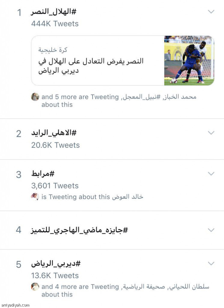 وصعد وسم #أمرابط الذي أطلقته الجماهير النصراوية إلى المركز الثاني في ترتيب قائمة الترند، متفوقًا على وسم #محيط الرعب و#صدارة بس، اللذين تراجعا بعد هدف التعادل للنصر.