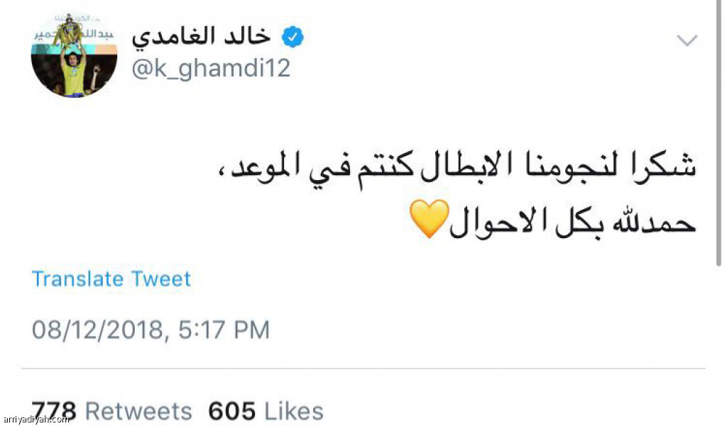 بث خالد الغامدي، لاعب فريق النصر الأول لكرة القدم، تغريدة مختصرة عبر حسابه في “تويتر”، شكر فيها زملاءه اللاعبين. وكتب الغامدي في التغريدة: “شكرًا لنجومنا الأبطال.. كنتم في الموعد، الحمد لله في كل الأحوال”.