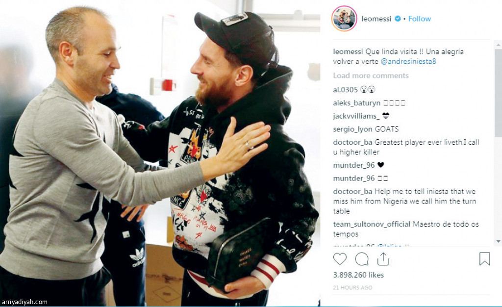 نشر الأرجنتيني ليونيل ميسي، قائد فريق برشلونة الأول لكرة القدم، على حسابه في "إنستجرام" صورته مع أندريس إنييستا، قائد الفريق السابق ولاعب فريق فيسيل الياباني، الذي زار النادي والتقى زملاءه القدامى وحضر معهم التدريبات، والتقط العديد من الصور مع اللاعبين الذين عانقوه بحرارة. الصورة نالت 3.898 مليون إعجاب بعد أقل من 24 ساعة من نشرها في الحساب الذي يبلغ عدد متابعيه 103 ملايين.