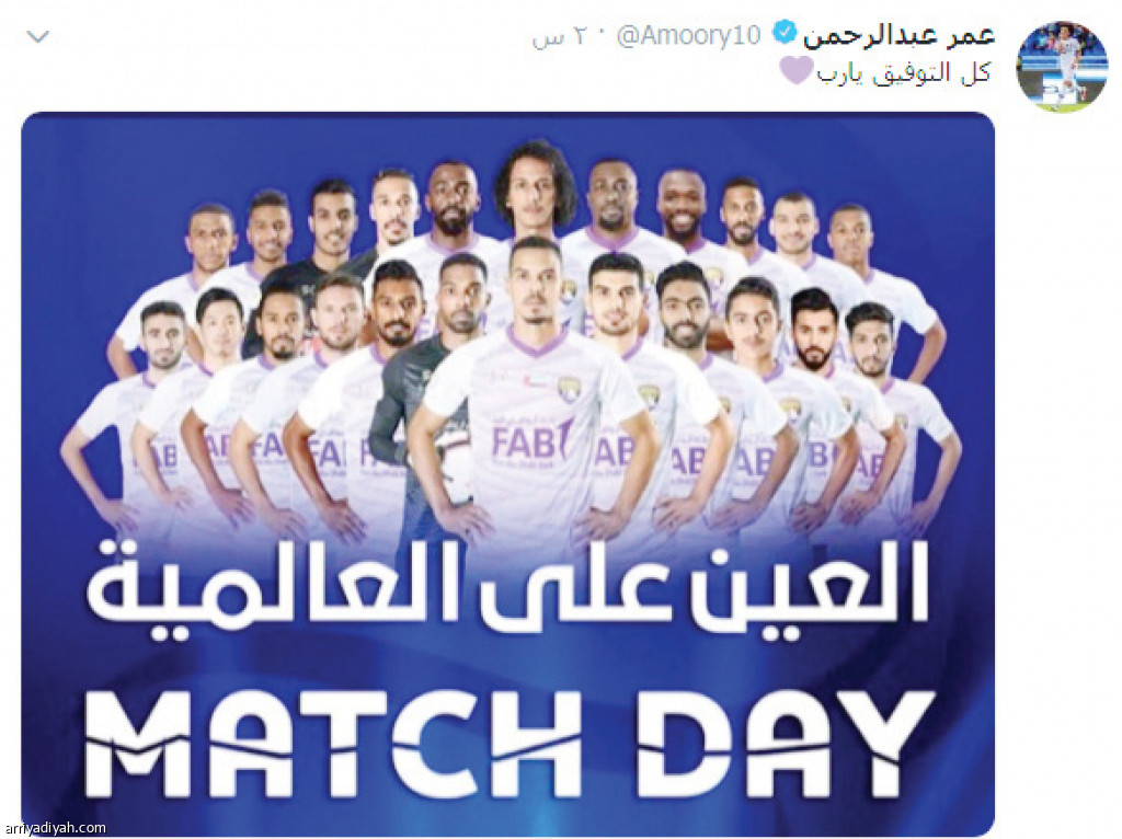 ونشر عموري عبر حسابه الشخصي في موقع التواصل الاجتماعي “تويتر” صورة لفريق العين، وكتب “العين على العالمية”، وعلَّق عليها كاتباً: “كل التوفيق يا رب”.