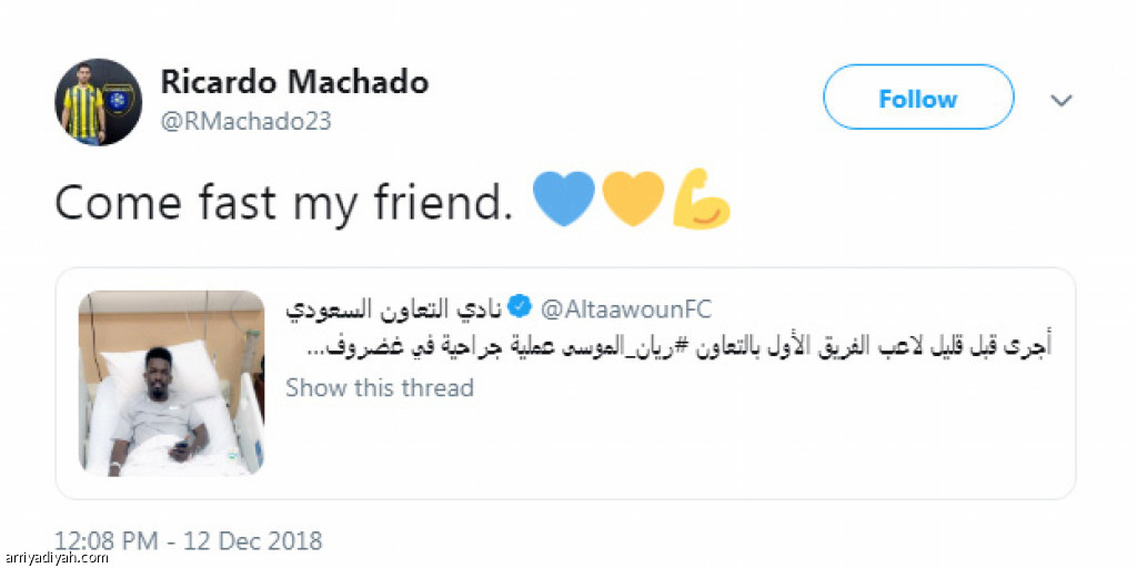 تمنَّى البرتغالي ريكاردو ماتشادو، محترف فريق التعاون، عودة ريان الموسى، زميله في الفريق، سريعًا إلى الملاعب بعد إجراء الأخير أمس عملية جراحية في غضروف الركبة.