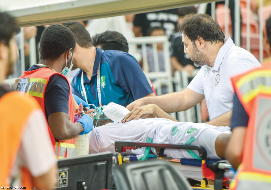 صورة التقطت أمس لحظة نقل محمد آل فتيل عبر سيارة الإسعاف عقب سقوطه مغمى عليه تصوير: محمد المانع