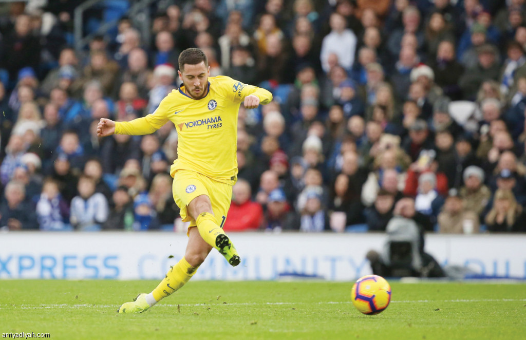 صورة التقطت أمس لهازارد أثناء إحرازه الهدف الثاني لفريقه تشيلسي في مباراته أمام برايتون التي انتهت 2ـ1 ضمن الجولة الـ 17 من الدوري الإنجليزي الممتاز (رويترز)