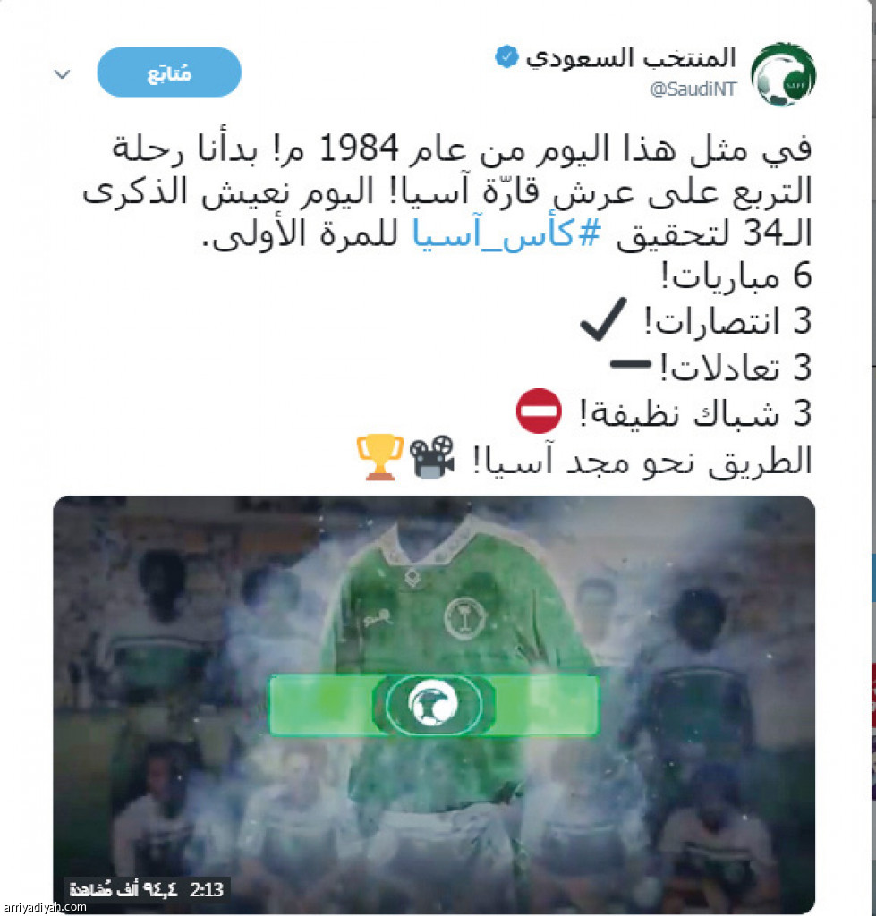 ونشر حساب الأخضر مقطع فيديو لمشوار الأخضر خلال مشاركته للمرة الأولى في بطولة كأس آسيا، وكتب: "في مثل هذا اليوم من عام 1984م.. بدأنا رحلة التربع على عرش قارّة آسيا.. اليوم نعيش الذكرى الـ 34 لتحقيق كأس آسيا للمرة الأولى.. 6 مباريات.. 3 انتصارات.. 3 تعادلات.. 3 شباك نظيفة.. الطريق نحو مجد آسيا".
