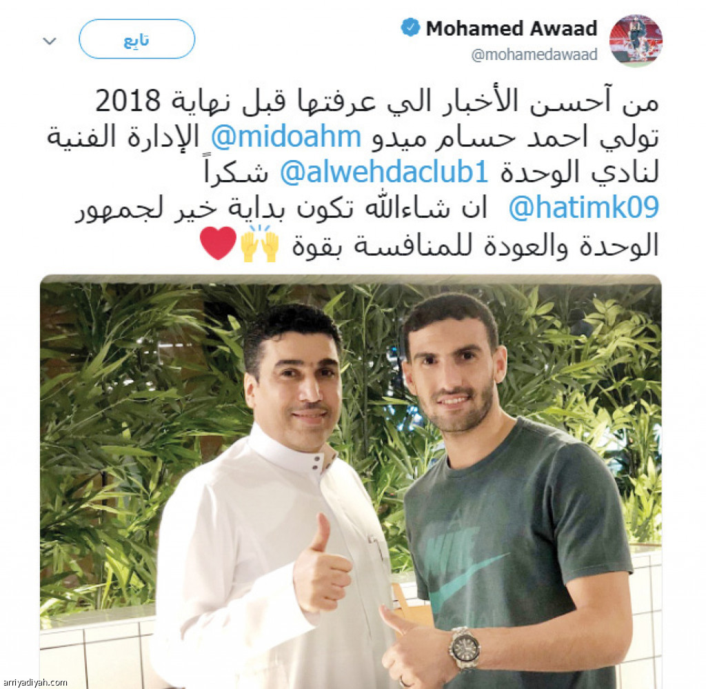 وكتب عواد عبر حسابه الشخصي في "تويتر" :"من أحسن الأخبار اللي عرفتها قبل نهاية 2018 تولي أحمد حسام ميدو، الإدارة الفنية لنادي الوحدة". وأضاف: "شكراً حاتم خيمي، إن شاء الله تكون بداية خير لجمهور الوحدة والعودة للمنافسة بقوة".