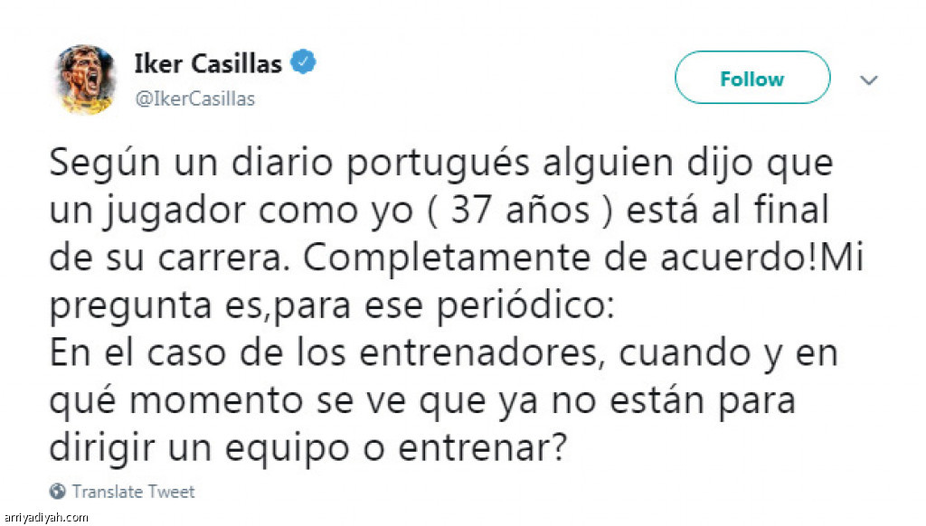 وكتب كاسياس، عبر حسابه في موقع التواصل الاجتماعي "تويتر": "الصحف تعدّ أن من يبلغ 37 عامًا في الملاعب، بات في نهاية مسيرته، سؤالي هو: متى تعدّ الصحف أن المدرب، لم يعد قادرًا على قيادة فريق".