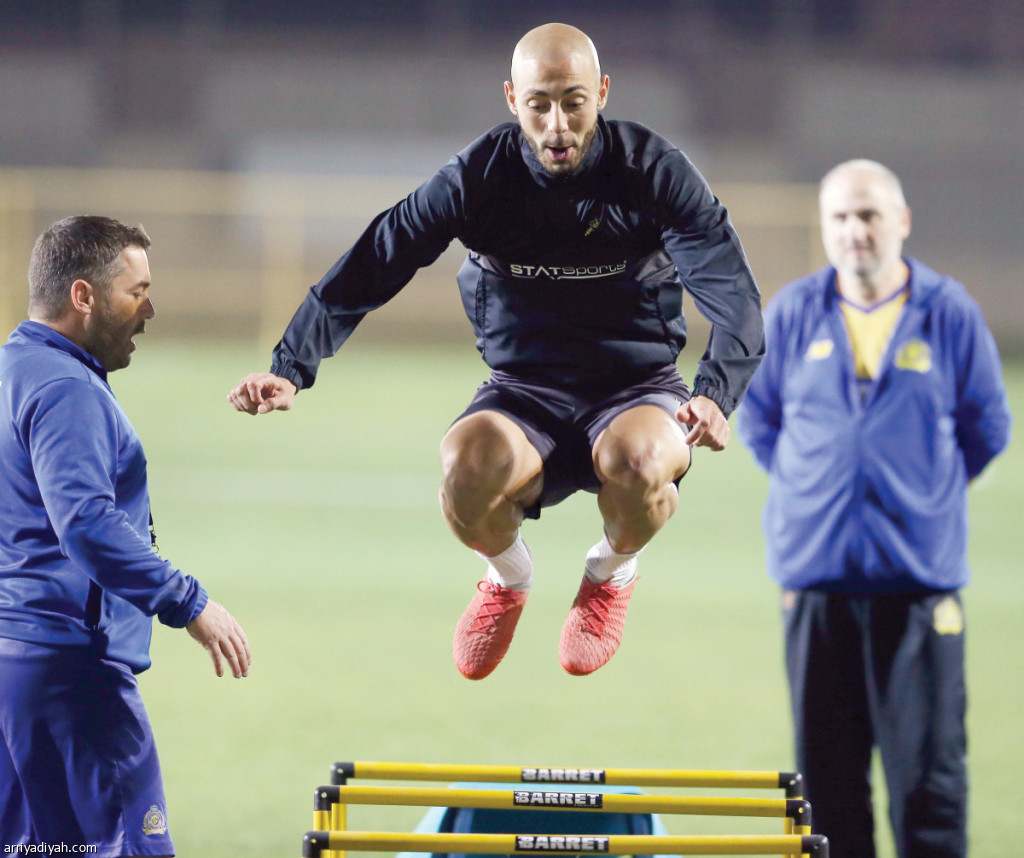صورة التقطت أمس للدولي المغربي نور الدين أمرابط لاعب وسط فريق النصر الأول لكرة القدم يؤدي تدريبات لياقية في تدريب فريقه الذي أُجري في مقر النادي ضمن التحضيرات للقاء الاتحاد الجمعة المقبل في إطار منافسات دوري كأس محمد بن سلمان للمحترفين تصوير: عبد العزيز النومان