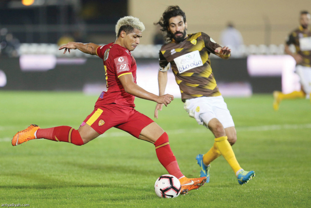صورة التقطت أمس لبسمارك لاعب فريق القادسية الأول لكرة القدم خلال تسديده الكرة وسط متابعة حسين عبد الغني قائد فريق أحد في المباراة التي انتهت لصالح القادسية3ـ1 ضمن منافسات دوري كأس محمد بن سلمان للمحترفين تصوير: عدنان مهدلي