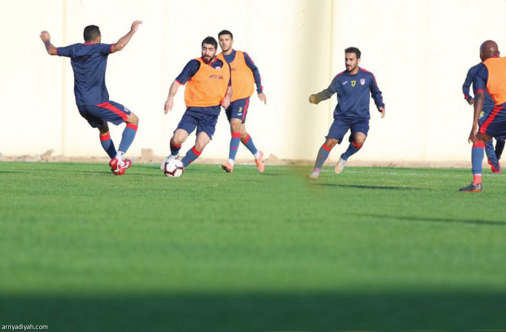 صورة التقطت أمس من المناورة التي فرضها الروماني إيسايلا مدرب فريق الحزم على اللاعبين.. ويظهر السوري يوسف قلفا يحاول تخطي أحد زملائه (المركز الإعلامي ـ الحزم)