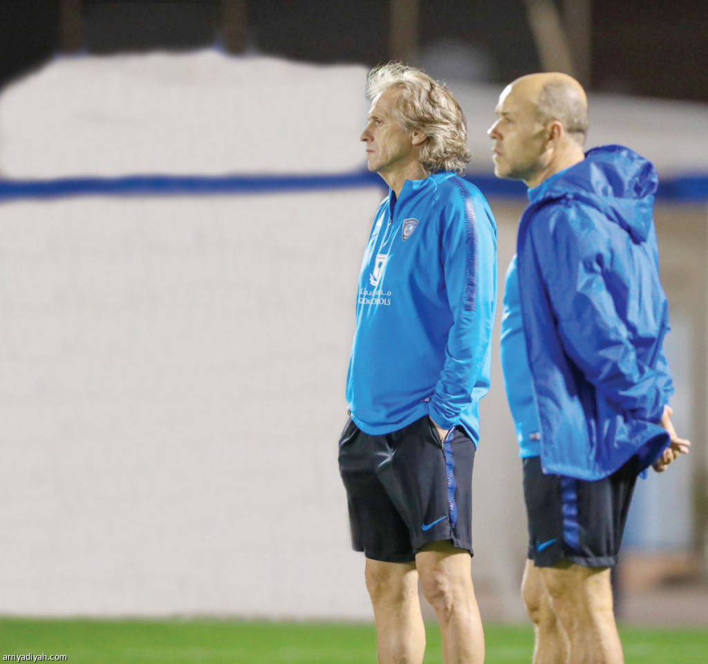 صورة التقطت أمس للبرتغالي خيسوس مدرب فريق الهلال الأول لكرة القدم مع أحد مساعديه خلال الحصة التدريبية التي تسبق لقاء الأهلي الجمعة المقبل(المركز الإعلامي ـ الهلال)
