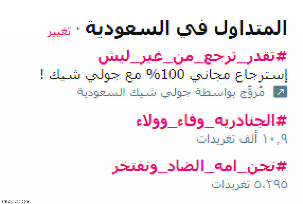 الـ 33، الذي تنظمه وزارة الحرس الوطني في الجنادرية تحت عنوان "وفاء وولاء". ووصل عدد زوار الهاشتاق إلى 3 ملايين و200 ألف، وشارك في الهاشتاق قرابة المليونين و900 ألف.