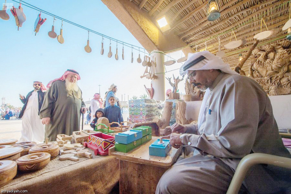 صورة التقطت أمس لزوار جناح منطقة القصيم يطالعون طريقة إحدى الصناعات اليدوية التراثية (واس)