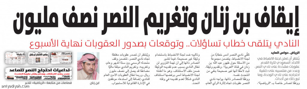 وأوقفت اللجنة أمس عبد الله بن زنان، المتحدث الرسمي باسم نادي النصر لمدة عام، وفرضت غرامة مالية عليه قدرها 300 ألف ريال، فيما قررت إيقاف محمد المسبل الأمين العام للنادي 6 أشهر، وتغريمه 100 ألف ريال، بينما وقعت غرامة ضخمة بقيمة 600 ألف ريال على النادي نفسه، بسبب مخالفات متعلقة بقضية مشاركة علي النمر لاعب فريق الوحدة أمام النصر في الجولة الـ11 من دوري كأس محمد بن سلمان للمحترفين.