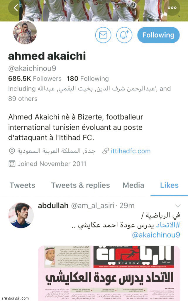 ونشرت "الرياضية" خبرًا مفاده، أن الإدارة الاتحادية تدرس إعادة أحمد العكايشي، اللاعب التونسي، إلى صفوف الفريق. وأثار الخبر الكثير من الاتحاديين عبر "تويتر"، وكتب بعضهم تغريدات عدة، ظهر فيها اسم "العكايشي".
