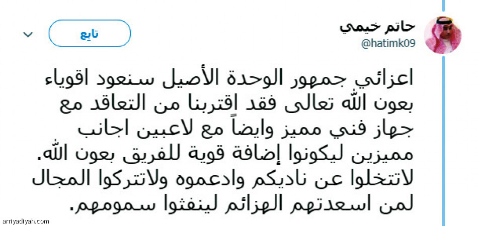 واختتم خيمي تغريداته كاتبًا: "أعزائي جمهور الوحدة الأصيل، سنعود أقوياء بعون الله تعالى فقد اقتربنا من التعاقد مع جهاز فني مميز، وأيضًا مع لاعبين أجانب مميزين، ليكونوا إضافة قوية للفريق بعون الله".