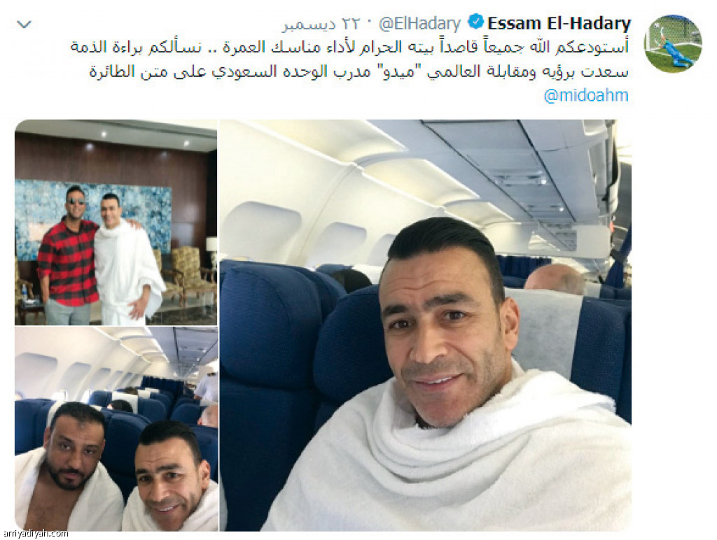 سافر المصري عصام الحضري، حارس مرمى منتخب مصر السابق وفريق الإسماعيلي، إلى السعودية لأداء مناسك العمرة. ونشر الحضري صورًا له على متن الطائرة بملابس الإحرام على حسابه في "تويتر"، وكتب: "أستودعكم الله جميعًا قاصدًا بيته الحرام لأداء مناسك العمرة.. نسألكم براءة الذمة".