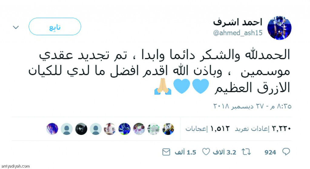 وعد أحمد أشرف، لاعب فريق الهلال الأول لكرة القدم، الجماهير الهلالية بتقديم الأفضل. وكتب أشرف، أمس، بعد تجديد عقده مع الفريق لمدة موسمين: "الحمد لله والشكر دائما وأبدا، تم تجديد عقدي موسمين، وبإذن الله أقدم أفضل ما لدي للكيان الأزرق العظيم".