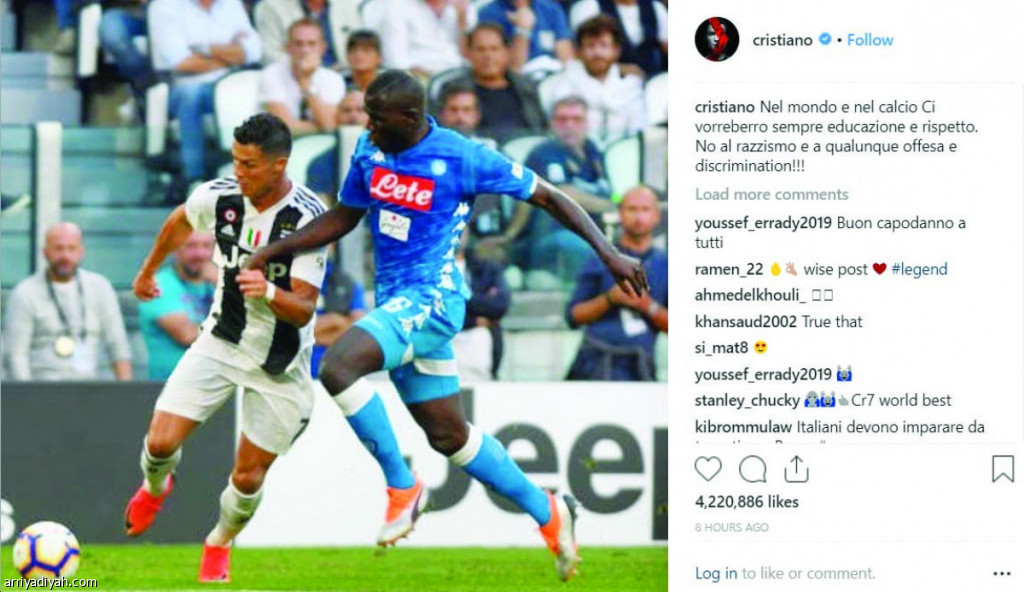 وجَّه البرتغالي كريستيانو رونالدو، لاعب يوفنتوس، رسالة يدعم فيها السنغالي كاليدو كوليبالي، مدافع نابولي، بعد تعرضه لهتافات عنصرية في مباراة فريقه أمام إنتر ميلان.